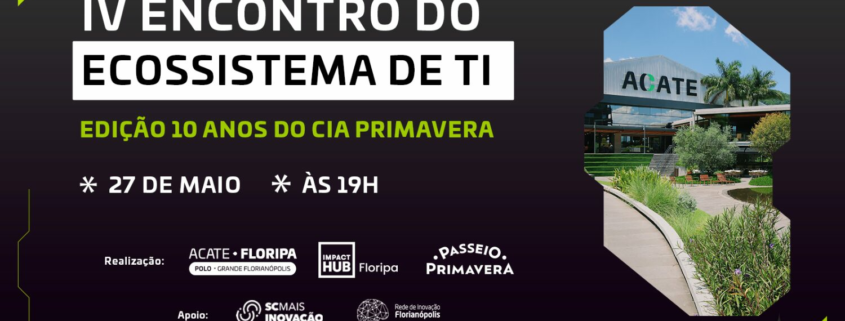 Esta é a quarta edição do Encontro do Ecossistema de TI, que será realizada pelo Polo da ACATE na Grande Florianópolis em parceria com o Impact Hub Floripa e o Passeio Primavera. São apoiadores o SC Mais Inovação, programa do Governo do Estado, e a Rede de Inovação Florianópolis, iniciativa da Prefeitura de Florianópolis com a ACATE.