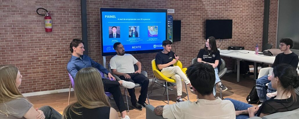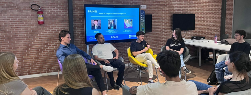 Os três jovens empreendedores abordaram “a real de empreender aos 20 e poucos” e como desenvolveram suas empresas. Caio Rossetto Coelho era estudante de Engenharia de Materiais e durante a graduação foi estagiário da incubadora de startups MIDITEC, da ACATE. Ele fundou a Cria.Ai após unir os desafios do escritório de advocacia de um familiar aos primeiros aprendizados sobre empreendedorismo que obteve enquanto estagiava. A empresa de Caio desenvolveu a primeira IA jurídica do Brasil e hoje está incubada no MIDITEC