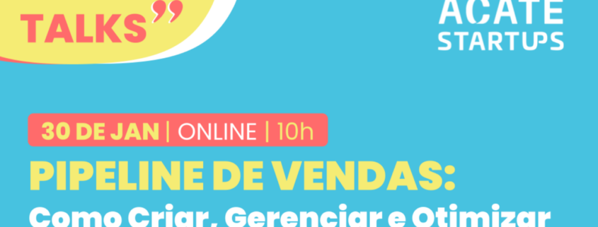 O pipeline de vendas é essencial para orientar a operação do time comercial de uma empresa. Sobre como criar, gerenciar e otimizar esta ferramenta que a ACATE realiza um bate-papo na próxima quinta-feira, dia 30 de janeiro, às 11h. O evento é exclusivo para startups associadas à ACATE e será realizado de forma online. As inscrições para participar do evento podem ser feitas neste link.